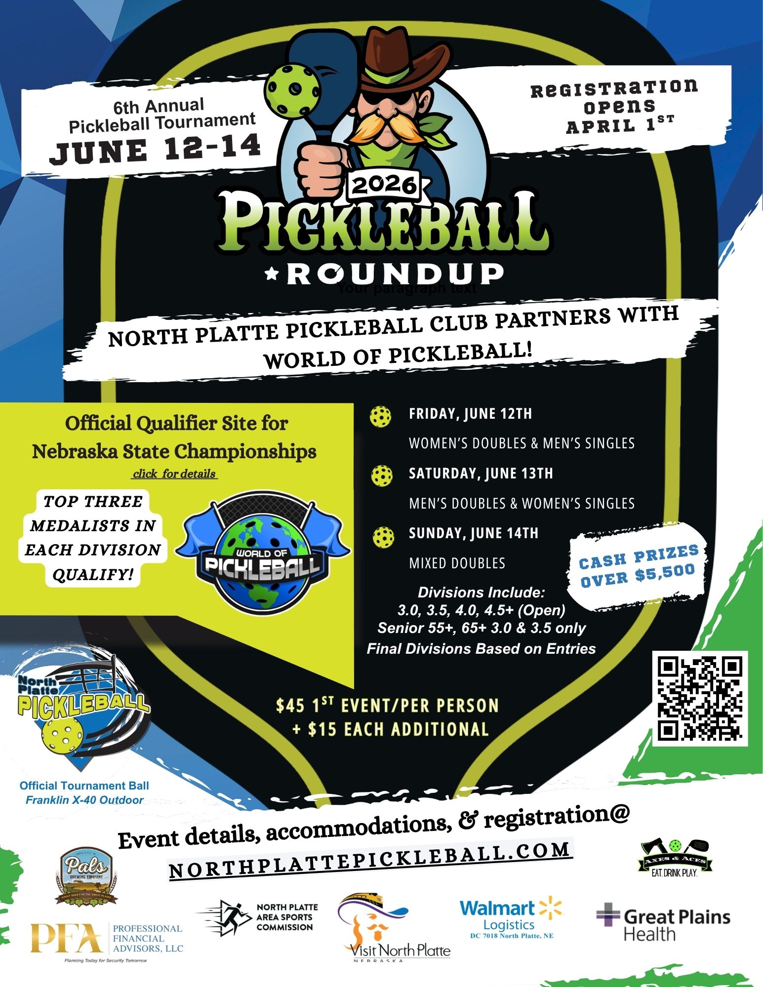 Save-the-Date for June 12-14th for the Annual Pickleball Roundup and World of Pickleball Nebraska State Qualifying Tournament!